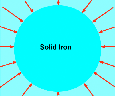 At this point, without energy from fusion to hold it back, gravity quickly smashes the iron core. Gravity is so much stronger in the core of a massive star than inside the sun, that even electron pressure is not enough to stop the collapse. The force of gravity is so great that electrons are essentially shoved inside protons, creating a solid ball of neutrons about 15 kilometers across. Imagine, if you can, a mass equal to our sun's, squeezed into a ball the size of Manhattan! |