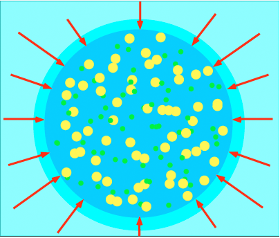 So, when no more Si is available to fuse into Fe, gravity crushes the core from being about the size of earth into a sphere 15 km across, in only one tenth of a second. During this time the Weak Force turns protons into neutrons, and a by-product of the reaction is created, a small particle called a neutrino. Neutrinos are produced in great quantities as the Weak Force turns the core into neutrons. Neutrinos don't like to interact with normal matter, so they stream out of the collapsing core at close to the speed of light, as if the star wasn't even there. So, a sudden burst of neutrinos rushes out from the star before any other change occurs on the surface. |