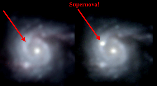 A supernova explosion releases so much energy that for a brief time, the supernova can outshine the entire galaxy it lives in. The initial power released is 1044 Watts, enough energy in one second to power our entire planet for trillions of years-- for a time beyond the survival of our solar system.