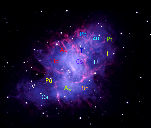 The energy of a SN explosion is so huge that elements heavier than iron are made in the debris. For the tall tower of building blocks, the supernova explosion itself provides the glue to make these large, heavy elements stable. This is how gold, silver, calcium, tin and other heavy elements are made. A supernova explosion is the only process that has enough energy to make these elements. So, any gold or silver you are wearing tonight, and even the calcium in your bones, were made in a supernova explosion eons before our sun and planets formed.