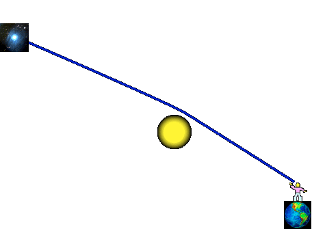 In this way, General relativity predicts that space-time around our sun is warped, and therefore the light coming from a background star should be deflected around the sun on its way to earth. The effect of the sun's warped space-time then should shift the apparent position of the star from its true location from our perspective on earth. |