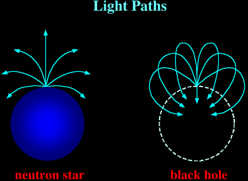 Space-time is so strongly warped here that only light goes fast enough to escape. But one hair's breadth inside the event horizon, not even light is fast enough to get away. At the event horizon, if you were to shine a flashlight straight up, the light would tumble right back to you.