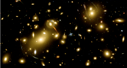 This is a picture taken by the Hubble Space Telescope which shows a thick cluster of galaxies. Very far behind this cluster are galaxies which are being gravitationally lensed--it is their light that makes the halos. In order for their light to be lensed in this way means that something truly massive and compact lies within this cluster. It might not be a supermassive black hole, but then again, it might.