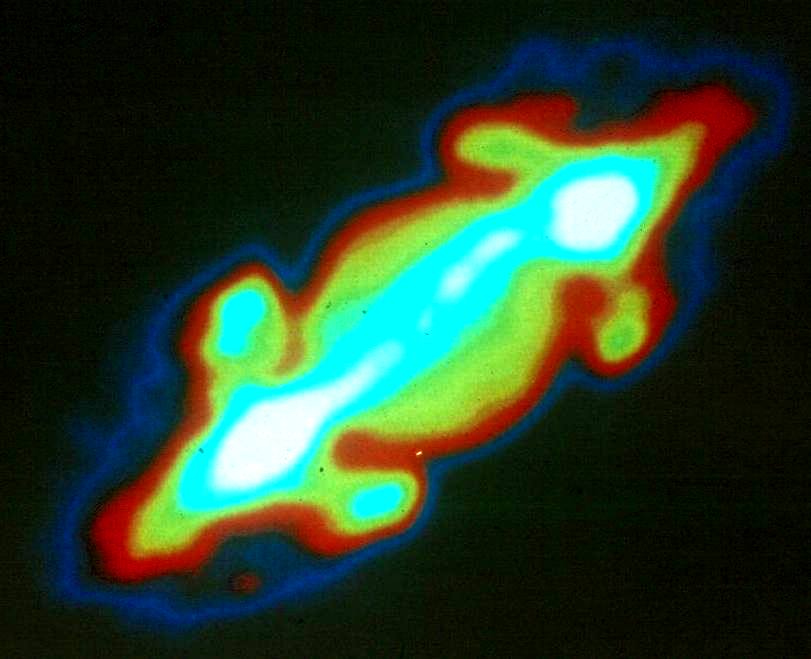 However, when viewed with light of 6 cm wavelength (on the right), Jupiter appears much larger! We call wavelengths of light in the centimeter range or longer RADIO LIGHT. Light at 6 cm shows us the structure of the magnetic field around Jupiter; in fact, if our eyes were sensitive to this wavelength of light, Jupiter would appear to be almost times larger than the full moon!!