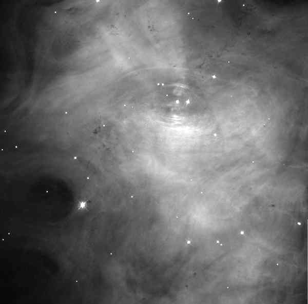 Modern research telescopes do not use film! They use computers with light detectors that are only sensitive to the number of photons that strike, just like our b&w eye cells that respond to intensity and not color. Modern cameras on telescopes don't care about the wavelength or color coming from the object, but only on the number of photons. Then the computer translates the intensity of light into shades of gray. On top is a visible-light image of the inner region of the Crab nebula taken by HST and displayed in shades of gray. However, the astronomer might prefer to look at a FALSE COLOR image, or a negative image instead of black & white. Sometimes color can be used to bring out faint features. |