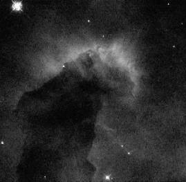 So, to obtain a true color image in astronomy, you have to take three (black & white) exposures, each one with a different color filter. Of course, this means taking three different images of the same object. Here are 3 images of the eagle nebula each taken with a different color filter, blue, green, and red. The computer records only the intensity of each image (black & white), and later colors each b&w image by the color of the filter used (shown on the far right). |