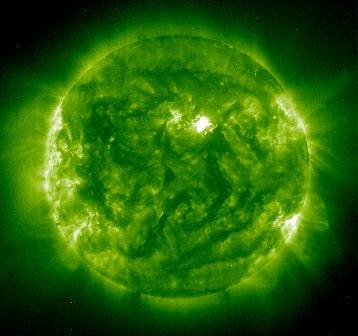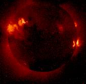 And in X-ray light (bottom)we see regions of the sun that are physically quite different. X-ray light is produced by very fast moving, hot gas, such as in the outer atmosphere of the sun called the corona. The corona is normally invisible to us, but using the light of X-rays, we can see this ultra-hot gas and study how it changes in time. The dark areas are where the sun has recently blasted off some of its surface material, literally punching holes in the corona. |