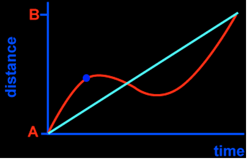If you want to know the instantaneous speed at a particular time, t, (for example, at the blue dot) then you start with the average speed and then sneak up on the point of interest. And then the slope at that point on the curve is the instantaneous speed. Newton called this mathematical method the Calculus.